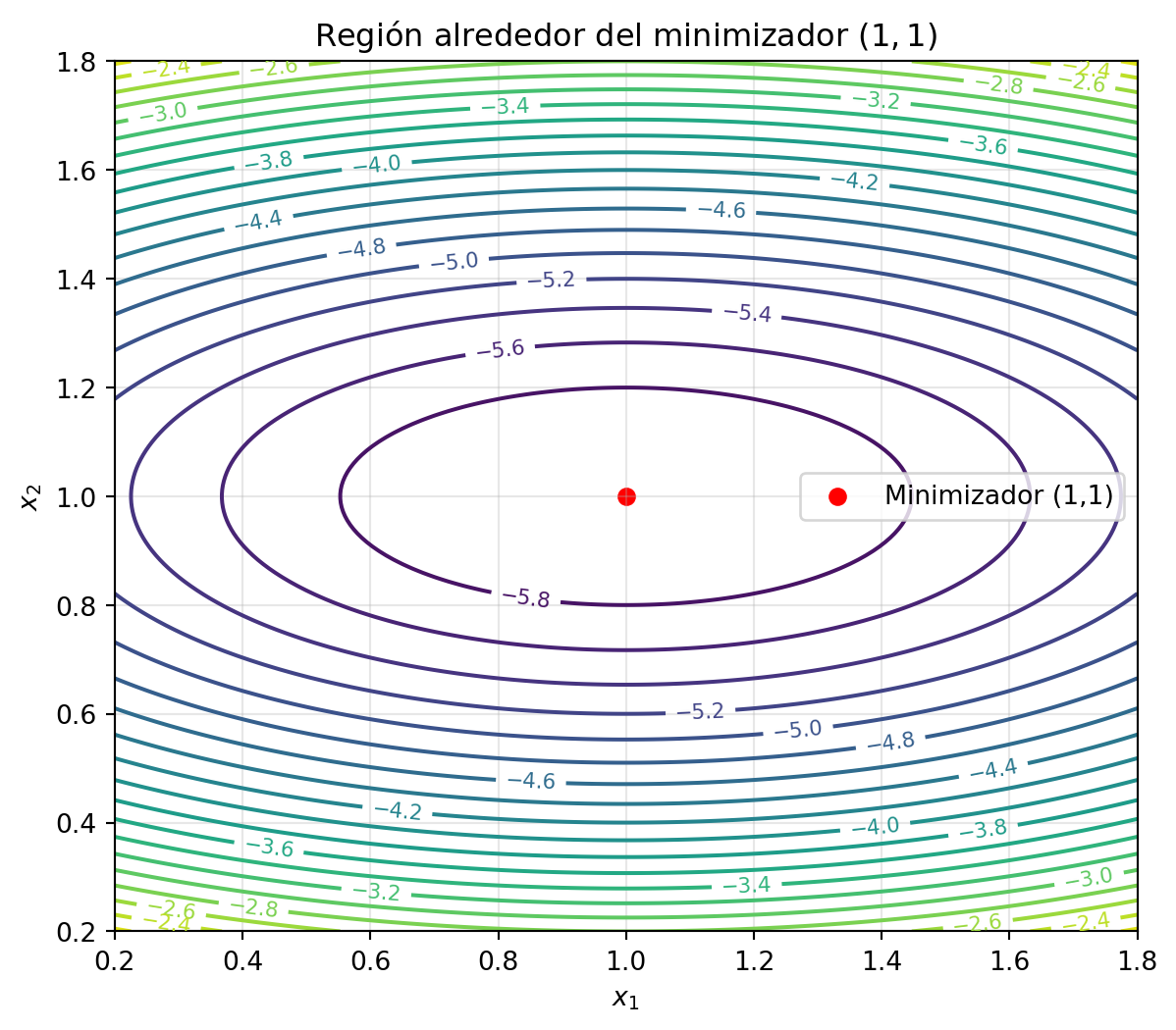 - Nuevo punto: \(x_2 \approx (1.022, 0.999)^\top\), muy cercano a \(x^\star = (1,1)^\top\).